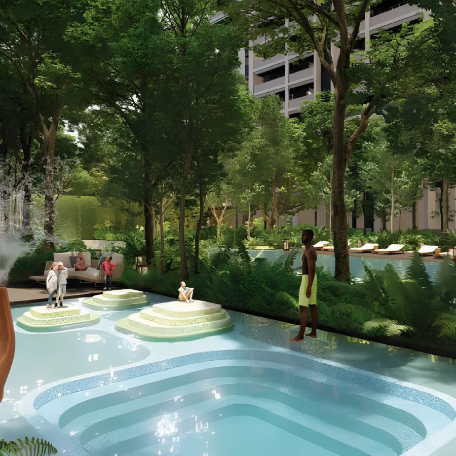 These flats stand out because of their remarkable design that seamlessly combines practicality with beauty. Magnificent glass facades define the High-rise towers which ascend into the sky to provide panoramic perspectives of the metropolis skyline and surrounding greenery. The layout of each condo maximizes spatial efficiency while incorporating natural ventilation and ample sunlight. The domestic interiors display luxury through lavish fittings and fashionable floors while present day aesthetics make every space sophisticated.